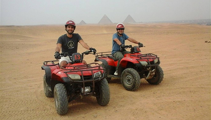 As Per Requested time at any time between (6:00 am to 17:00 Pm) Pickup from your hotel in Cairo or Giza by Our guide and transfer you to Giza Pyramids and get your ride ready then Start the Quad Bike Tour the Buggy Tour is quite simply the most exciting way to discover all the ancient wonders of Egypt. These custom-made buggies are capable of whisking over the dunes at speeds over 50 mph taking you to places where most tourists never get to see. Riding through the desert is a thrilling experience and will make your Holidays in Egypt unforgettable with Amazing Pictures of you behind the panoramic view of the Pyramids. after the Tour Finish transfer you Back to your hotel.